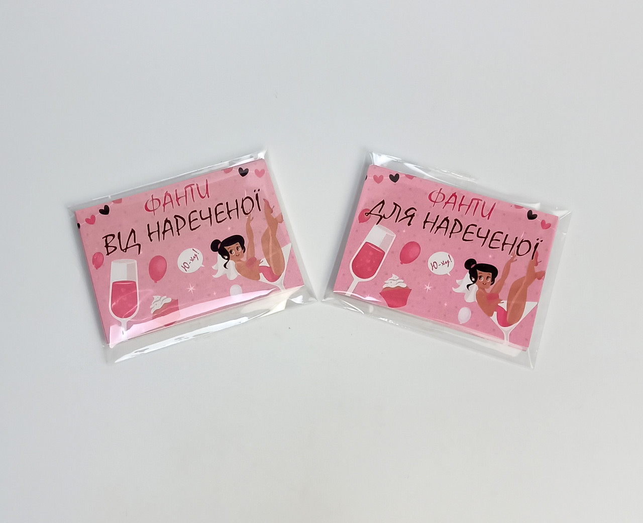Фанти "Для Нареченої" - це набір карток, на яких надруковано завдання і запитання, на які відповідає наречена. Оскільки це все ж її свято. то покарання за невиконаний фант вона встановлює собі сама.